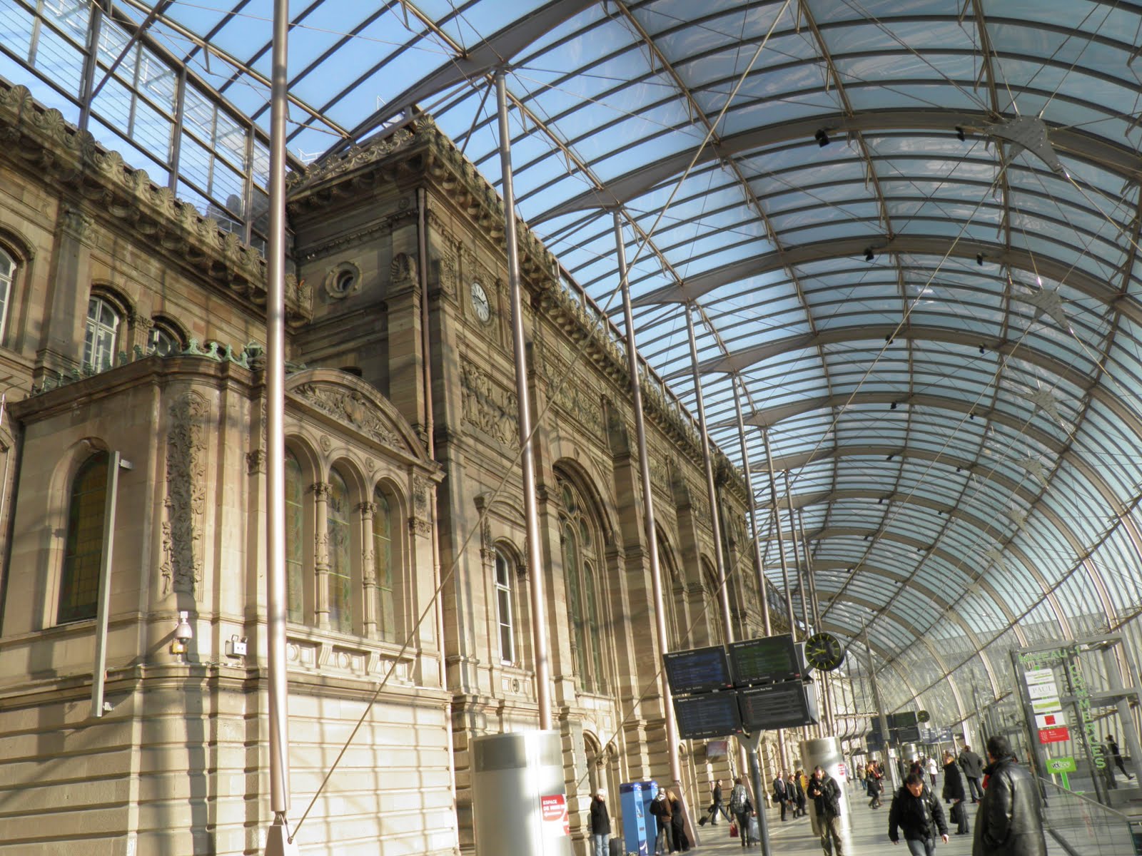 Bahnhof Strasbourg mit der Glaskuppel, am 3.März, 9 Uhr. Schon hier Sonne am blauen Himmel, trockene Kälte, die uns die ganze Woche über begleiten werden.